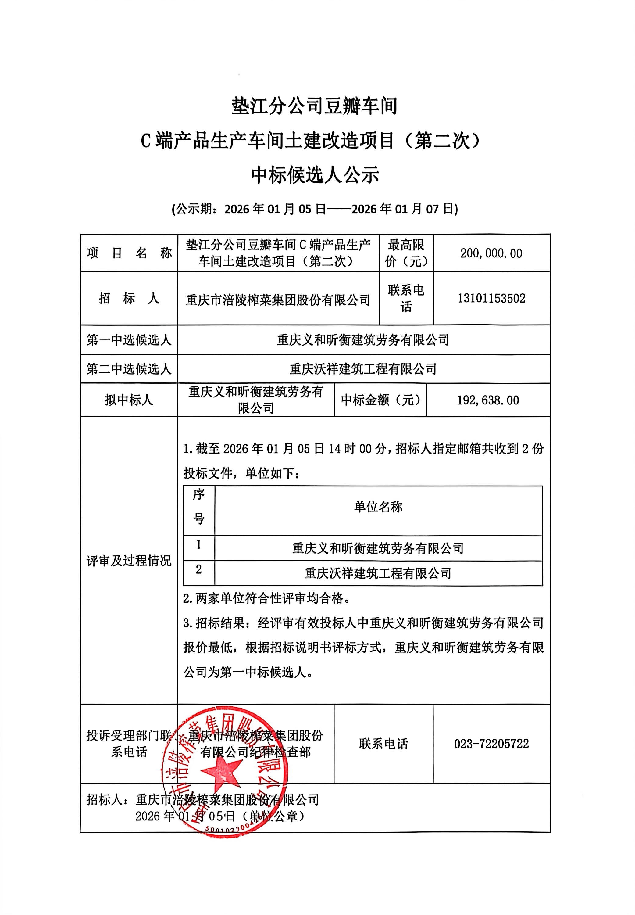2.两家单位符合性评审均合格。 3.招标结果:经评审有效投标人中重庆义和昕衡建筑劳务有限公司报价最低,根据招标说明书评标方式,重庆义和昕衡建筑劳务有限公司为第一中标候选人。 |